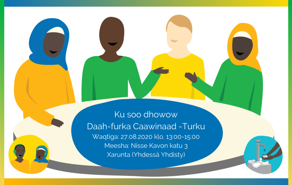 Suomi-Somalia seura ry ja Länsi-Suomen Somaliseuran Caawinaad hankkeen kick-off -tilaisuus järjestetään 12.08.2020 klo. 13:00-15:00 Globaalikeskus, Siltasaarenkatu 4, 7 kerros. Hanke on saanut rahoitusta STEA:lta ja sen tarkoituksena on auttaa somaliyhteisöä koronaviestinnässä sekä neuvonnassa. Hanke tulee tarjoamaan puhelinpalvelua sekä asiantuntijaneuvontaa. Lisää tietoa hankkeesta löytää: